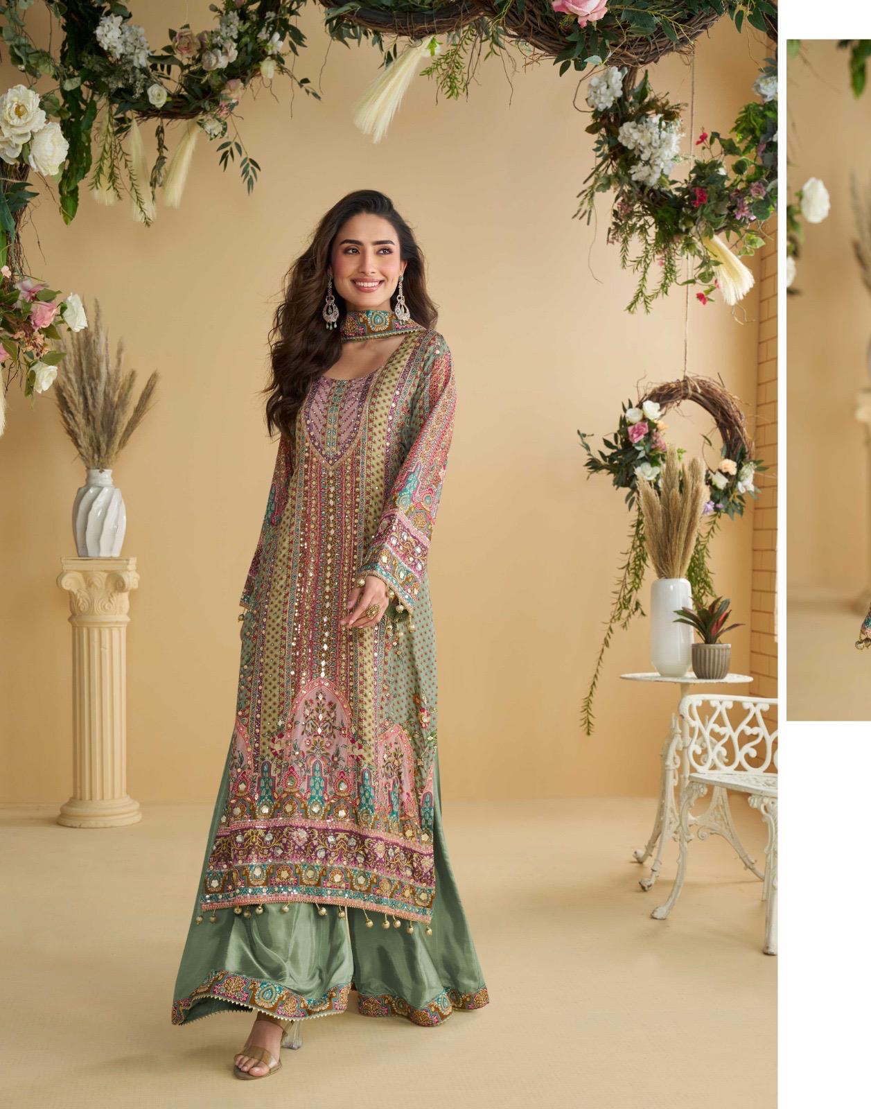 FABRIC – PREMIUM NATURAL CREP SILK ( LATEST TRENDY NATURAL CREP PRINTED TOP AND PLAZZO WITH HAND AARI WORK, EMBLLISHED GOTA PATTI AARI WORK ALL OVER DETALING WITH GOTA TASSALES DUPATTA )