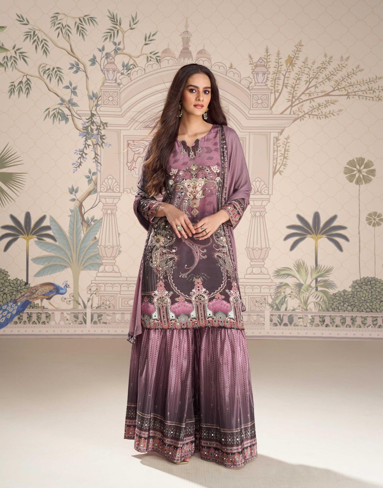 FABRIC – PREMIUM REAL CREP SILK ( FULL STYLIST LOOK EMBLISSIED MIRROR WORK TOP WITH GHARARA AND DUPATTA )