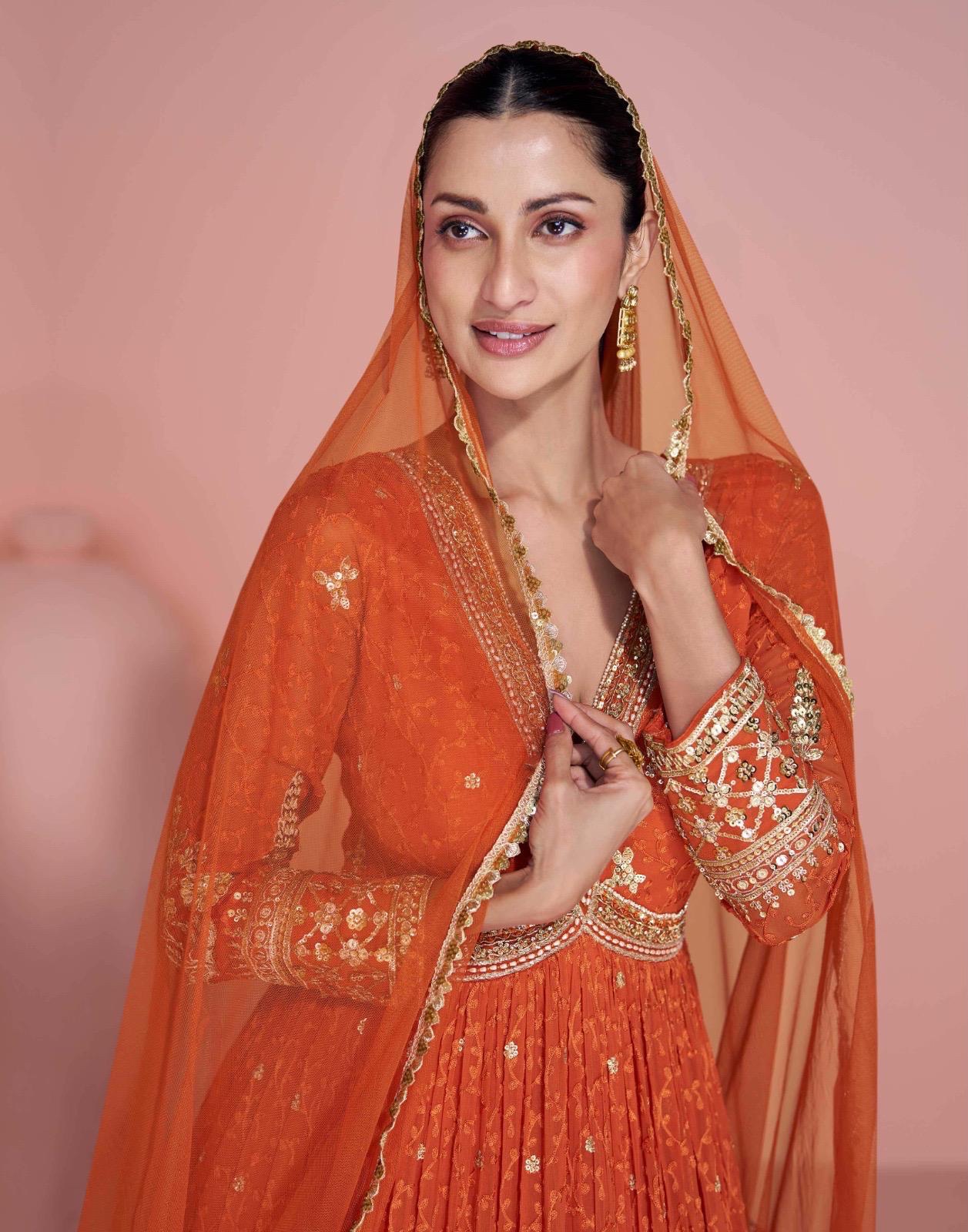 FABRIC – PREMIUM REAL GEROGETTE ( TREDY FESTIVE LOOK FRONT AND BACK EMBROIDERED GEROGETTE GOWN WITH DUPATTA )