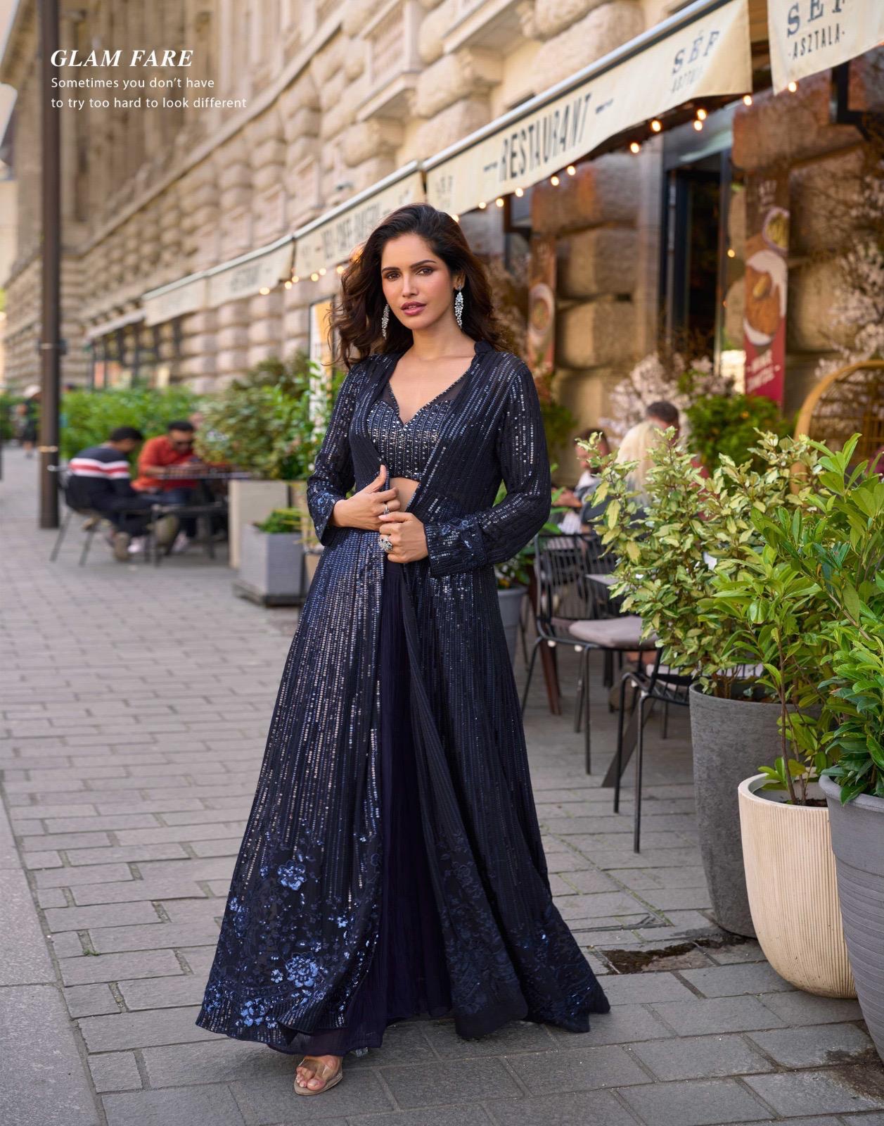 FABRIC – REAL PREMIUM GEROGETTE ( FULL HEAVY LOOK FRONT AND BACK EMBROIDERED FLOOR LENGHT JACKET WITH EMBROIDERED BLOUSE AND PLAZZO )