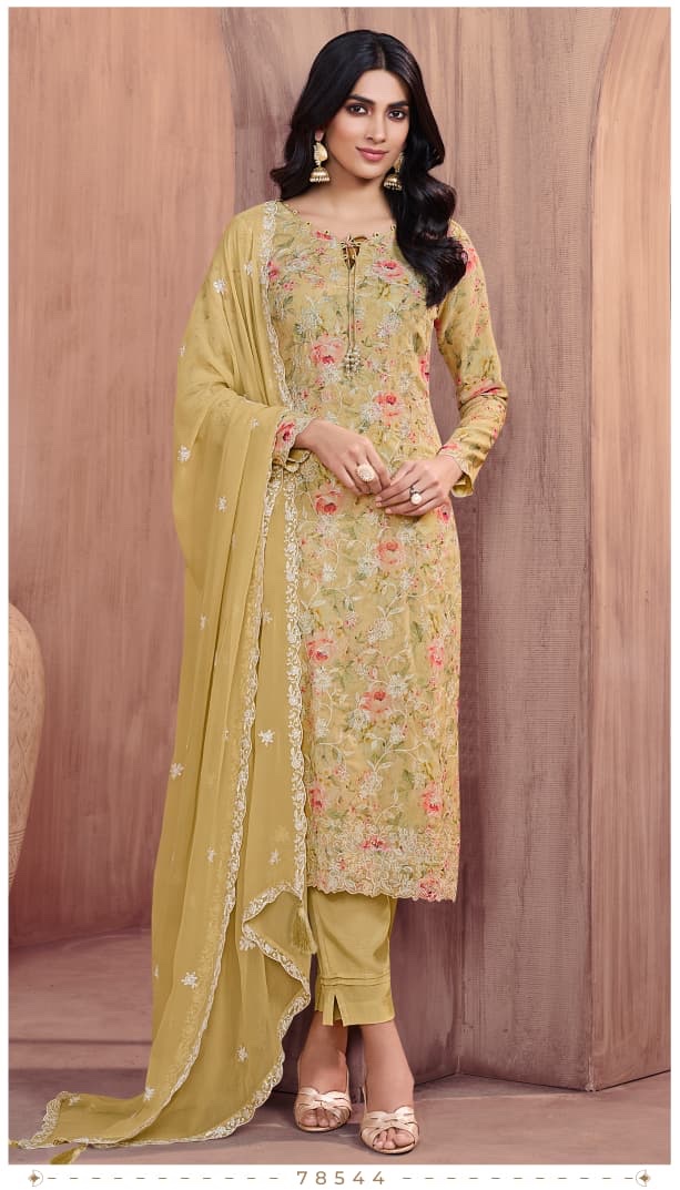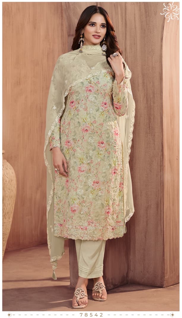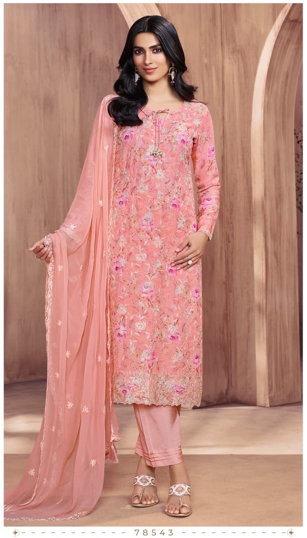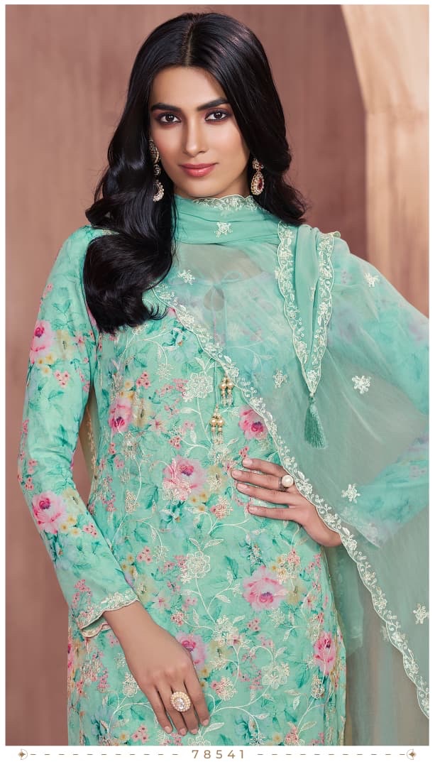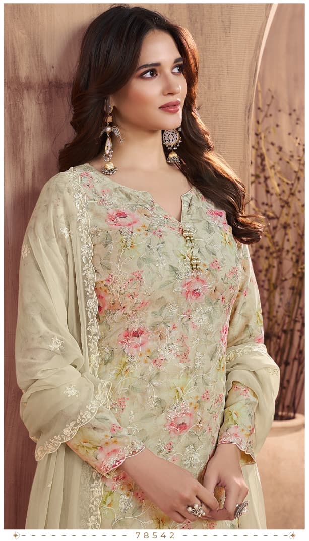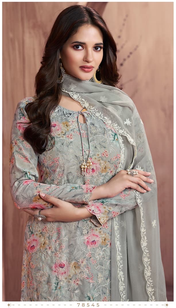 *ELEGANT DIGITAL-PRINTED GEORGETTE SUIT WITH FLORAL THREAD EMBROIDERY & DESIGNER HANGINGS TOP WITH SANTOON BOTTOM AND, EMBROIDEREDGEORGETTE DUPATTA WITH LATKAN*