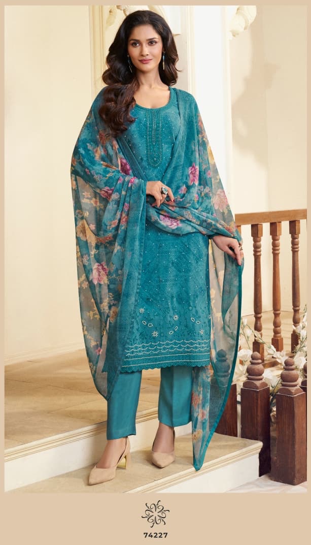 * *TOP : DIGITAL PRINTED ROYAL CREPE WITH EMBROIDERY AND ZARKAN WORK*